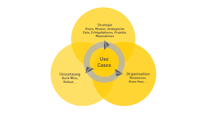 Dieses Ziel zu erreichen erfordert neben der technischen Implementierung eine organisatorische Transformation und damit ein systematisches Vorgehen und berücksichtigt idealerweise auch eine langfristige strategische Perspektive. Im Kern dieses Entwicklungsprozesses stehen klar definierte Use-Cases, die dem Projekt von Anfang an einen klaren Fokus in Richtung internem und externem Nutzen geben.